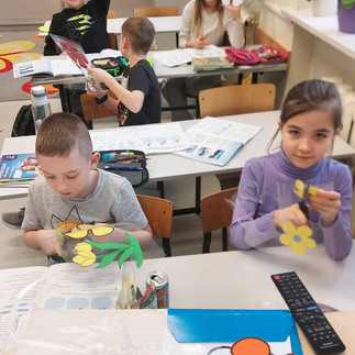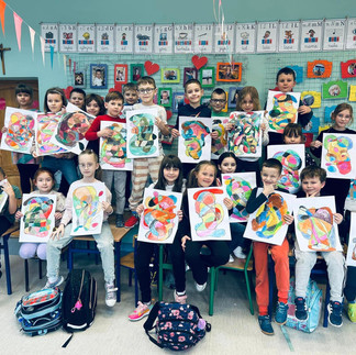 Rozwijamy się plastycznie i twórczo. Malujemy nitką, tworzymy akwarelowe abstrakcje, projektujemy, wycinamy i szyjemy, tworzymy instrumenty strunowe i wiosenne ozdoby do swoich gabinetów.